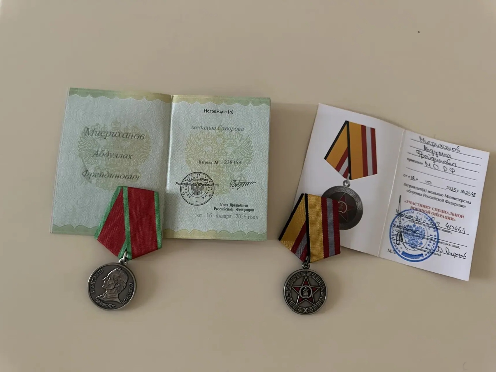 Помимо этого за успешное выполнение задач, способствующих достижению целей специальной военной операции, военнослужащий Абдуллах Мисриханов был награжден медалью «Участнику специальной военной операции».